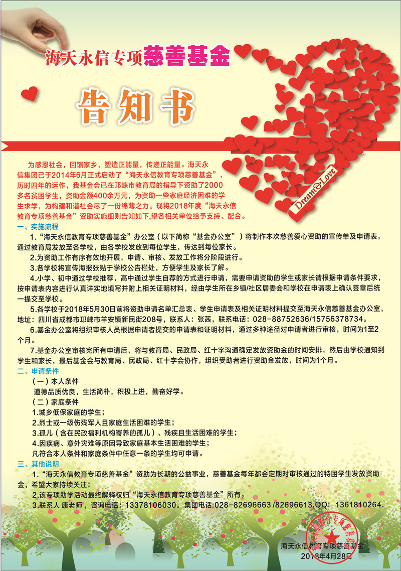 为感恩社会,回馈家乡,塑造正能量,传递正能量。海天永信集团已于2014年6月正式启动了“海天永信教育专项慈善基金”,历时四年的运作,我基金会已在邛崃市教育局的指导下资助了2000多名贫困学生,资助金额400余万元,为资助一些家庭经济困难的学生求学,为构建和谐社会尽了一份绵薄之力。现将2018年度“海天永信教育专项慈善基金”资助实施细则告知如下,望各相关单位给予支持、配合。